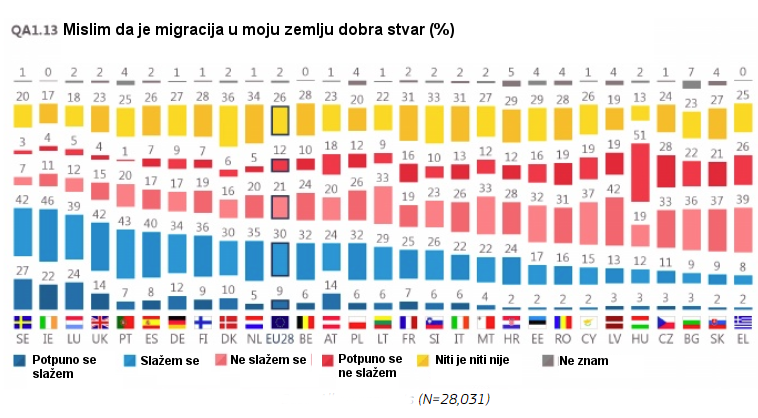 Postoji osam zemalja u kojima se barem pola ispitanika ne slaže, poglavito Mađarska (70%), Grčka (65%) te Latvija i Češka (obje 61%). Sveukupno gledano, postoji 15 zemalja u kojima se ispitanici u potpunosti ne slažu. Važno je napomenuti da se većina ispitanika u Mađarskoj (51%) potpuno ne slaže, kao što i 28% u Češkoj i 26% u Grčkoj.